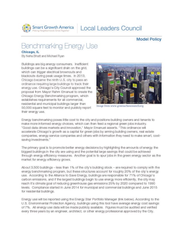 In 2013, Chicago became the ninth U.S. city to pass an ordinance requiring large buildings to track their energy use. Chicago’s City Council approved the proposal from Mayor Rahm Emanuel to create the Chicago Energy Benchmarking program, which establishes requirements for all commercial, residential and municipal buildings larger than 50,000 square feet to monitor and publicly report their energy use.