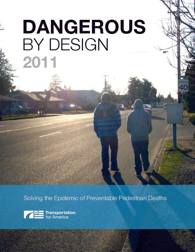 Dangerous by Design 2011 spotlights the issue of pedestrian safety and the factors that make walking dangerous. Using ten years of pedestrian fatality data, as well as newly-released Census data on walking, we calculate a Pedestrian Danger Index (PDI) to rank the country's largest metropolitan areas according to their relative risk to walkers. Further, we mine the data for details on who is most likely to be killed, and what types of roads are most dangerous for pedestrians.