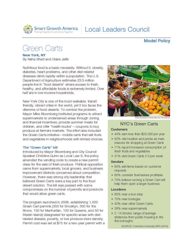New York City is one of the most walkable, transit friendly, vibrant cities in the world, yet it too faces the dilemma of food deserts. To combat the problem, Mayor Mike Bloomberg instituted programs to attract supermarkets to underserved areas through zoning and financial incentives, provide summer meals for children, and offer “health bucks” — coupons to buy produce at farmers markets. The effort also included the Green Carts initiative — mobile carts that sell fruits and vegetables in neighborhoods with limited choices.