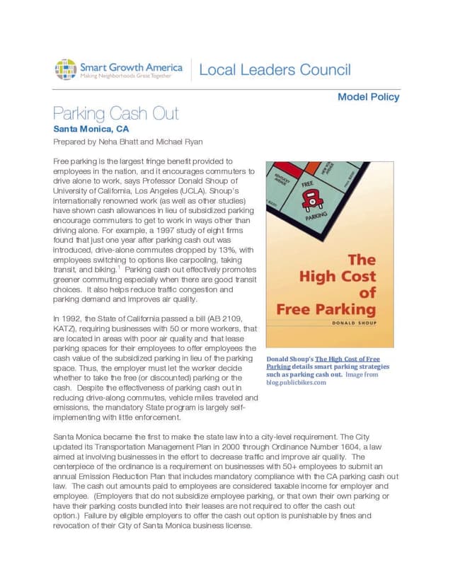 Free parking is the largest fringe benefit provided to employees in the nation, and it encourages commuters to drive alone to work, says Professor Donald Shoup of University of California, Los Angeles (UCLA). Shoup’s internationally renowned work (as well as other studies) have shown cash allowances in lieu of subsidized parking encourage commuters to get to work in ways other than driving alone. For example, a 1997 study of eight firms found that just one year after parking cash out was introduced, drive-alone commutes dropped by 13%, with employees switching to options like carpooling, taking