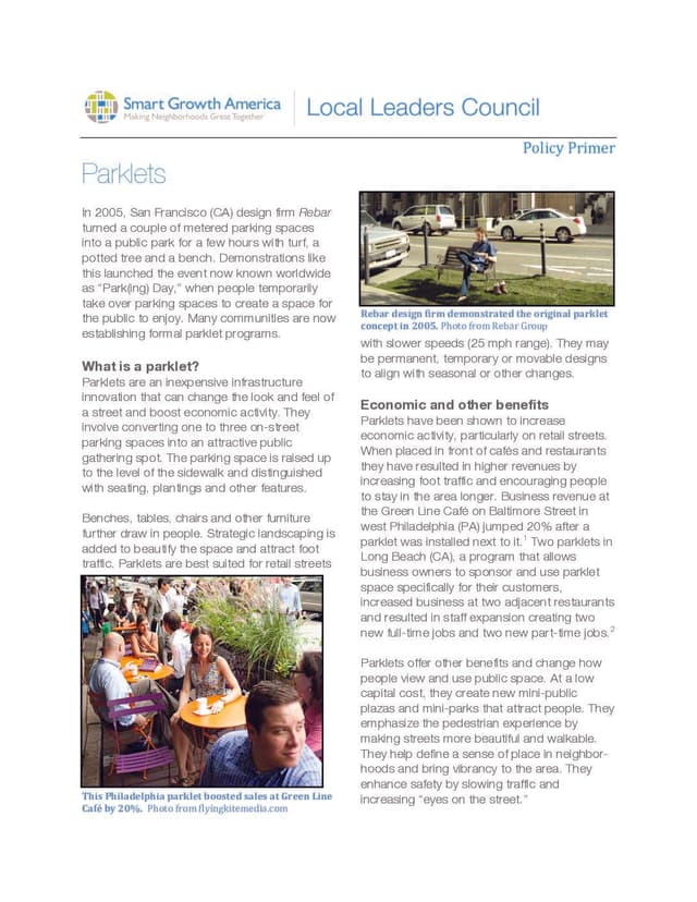 In 2005, San Francisco (CA) design firm Rebar turned a couple of metered parking spaces into a public park for a few hours with turf, a potted tree and a bench. Demonstrations like this launched the event now known worldwide as “Park(ing) Day,” when people temporarily take over parking spaces to create a space for the public to enjoy. Many communities are now establishing formal parklet programs.