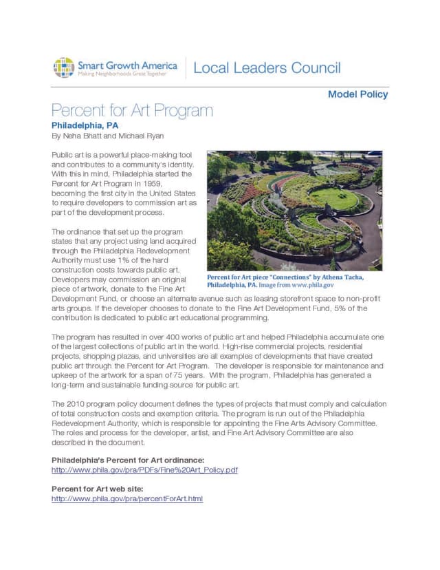 The ordinance that set up the program states that any project using land acquired through the Philadelphia Redevelopment Authority must use 1% of the hard construction costs towards public art. Developers may commission an original piece of artwork, donate to the Fine Art Development Fund, or choose an alternate avenue such as leasing storefront space to non-profit arts groups.