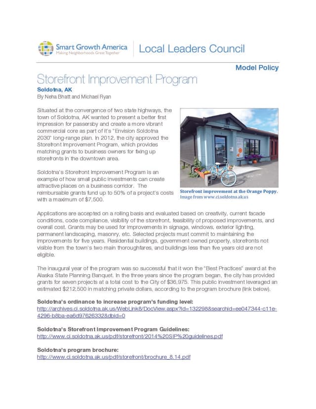 Grants may be used for improvements in signage, windows, exterior lighting, permanent landscaping, masonry, etc. Soldotna’s Storefront Improvement Program is an example of how small public investments can create attractive places on a business corridor.