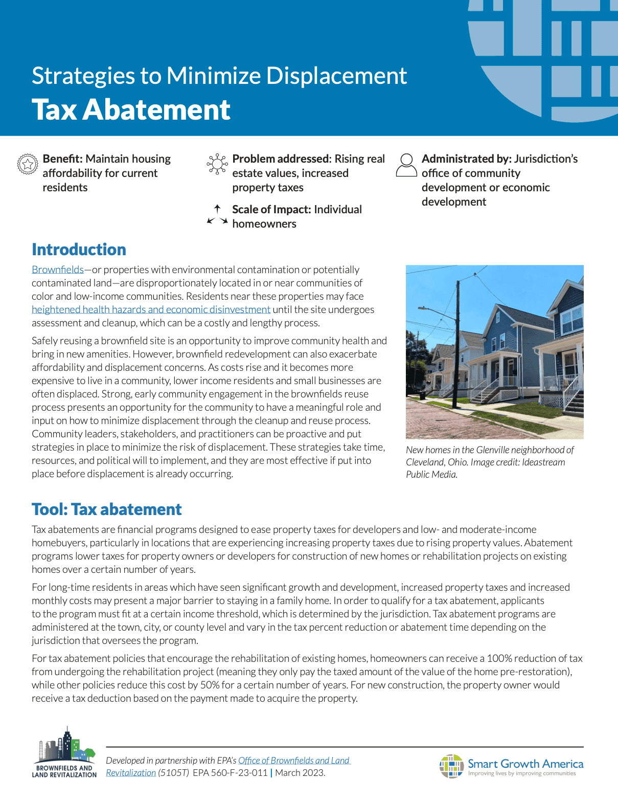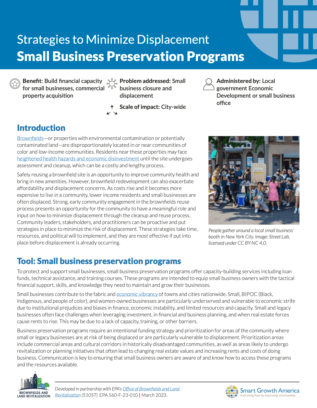 Brownfields—or properties with environmental contamination or potentially contaminated land—are disproportionately located in or near communities of color and low-income communities. Residents near these properties may face heightened health hazards and economic disinvestment until the site undergoes assessment and cleanup, which can be costly and lengthy. Safely reusing a brownfield site is an opportunity to improve community health, spur economic investment, and bring in new amenities. However, brownfield redevelopment can also exacerbate affordability and displacement concerns. As rent and property taxes rise and it becomes more expensive to live in a community, lower-income residents and small businesses may be displaced. Strong, early community engagement in the brownfields reuse process presents an opportunity for the community to have a meaningful role and input on how to minimize displacement throughout the planning, cleanup, and reuse process. Community leaders, stakeholders, and practitioners can be proactive and implement strategies to minimize the risk of displacement. These strategies take time, resources, and political will to implement, and they are most effective if put into place before displacement is already occurring.