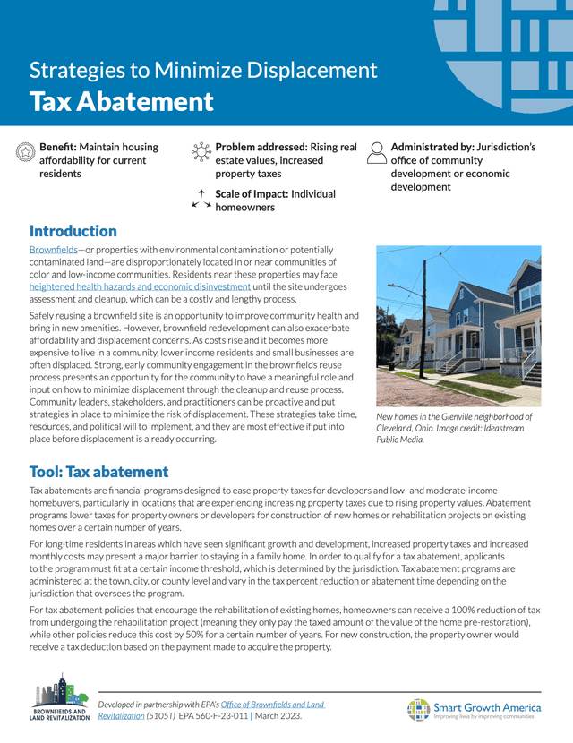 Safely reusing a brownfield site is an opportunity to improve community health and bring in new amenities. However, brownfield redevelopment can also exacerbate affordability and displacement concerns. As costs rise and it becomes more expensive to live in a community, lower income residents and small businesses are often displaced. Strong, early community engagement in the brownfields reuse process presents an opportunity for the community to have a meaningful role and input on how to minimize displacement through the cleanup and reuse process. Community leaders, stakeholders, and practitioners can be proactive and put strategies in place to minimize the risk of displacement. These strategies take time, resources, and political will to implement, and they are most effective if put into place before displacement is already occurring.