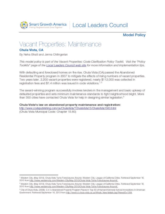 The award-winning program successfully involves lenders in the management and basic upkeep of defaulted properties and sets minimum maintenance standards to fight neighborhood blight. More than 350 cities have contacted Chula Vista for help in designing similar legislation.