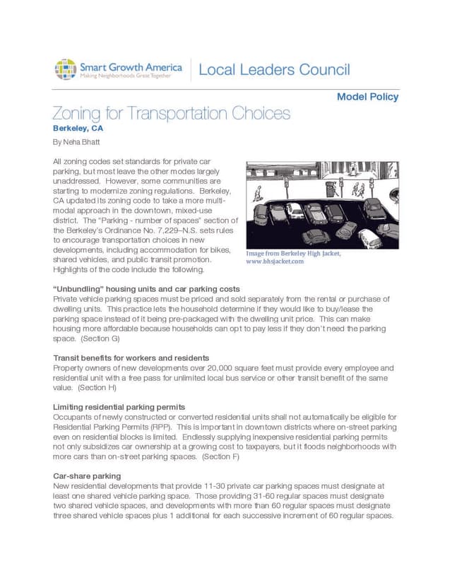 The “Parking - number of spaces” section of the Berkeley’s Ordinance sets rules to encourage transportation choices in new developments, including accommodation for bikes, shared vehicles, and public transit promotion. Highlights of the code include the following.