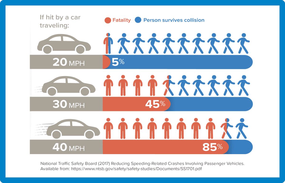 Speed is the number one culprit in traffic fatalities. Speed is also the best predictor of whether or not a collision will result in an injury or a death. (In addition to the size of vehicles, which are rapidly increasing, but that’s another conversation.)
